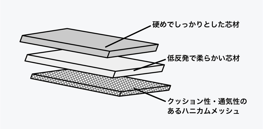 肩パッドは、硬さの違う2種類の芯材を重ねる事で、肩に優しくなじみながらもへたれにくいように仕上げました。肩に当たる面にはメッシュ素材を使用。衣類を傷つけにくく、長時間背負っても蒸れにくいパッドになっています。
